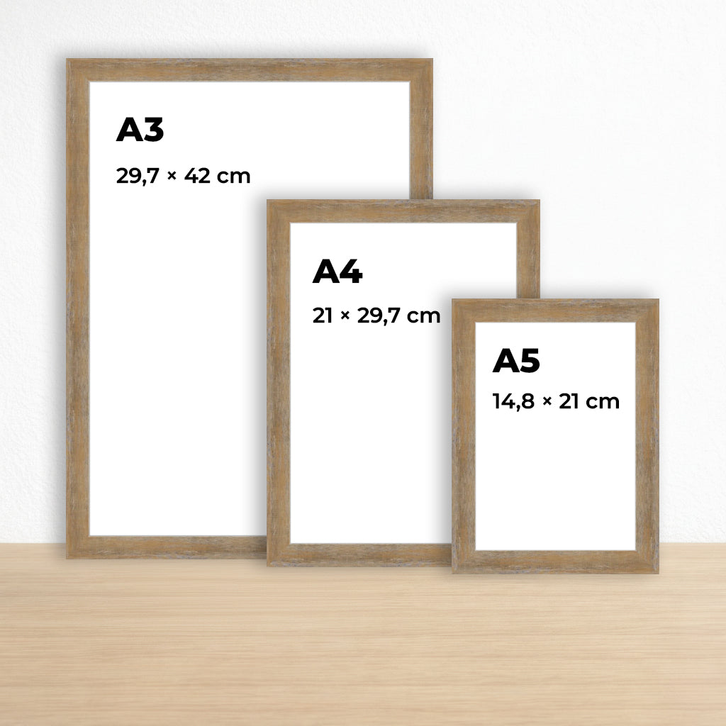 Zamansız altın rengi ve dengeli formuyla öne çıkan bu ahşap çerçeve, belge, sertifika, fotoğraf ve sanat baskıları için net ve güçlü bir sunum sağlar. A3, A4 ve A5 kağıt ölçüleriyle tam uyumludur.