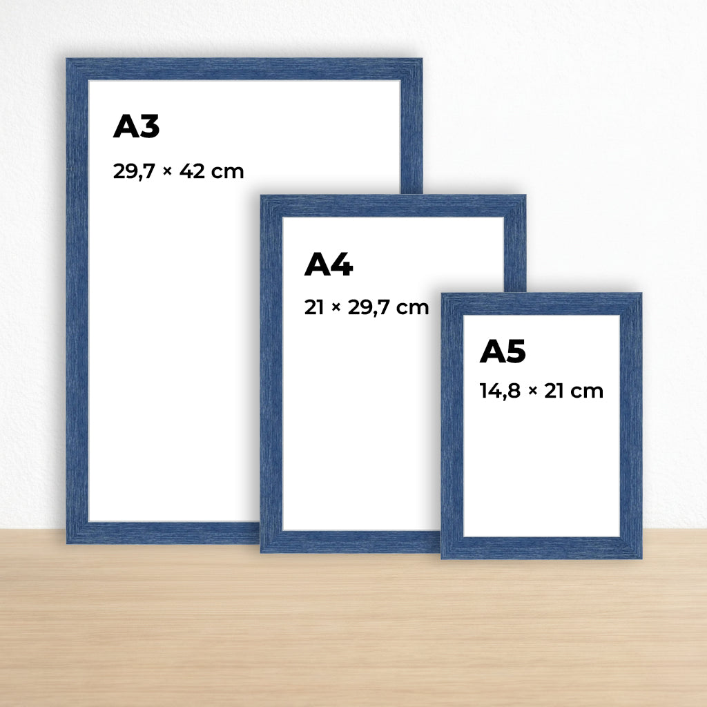 Zamansız lacivert rengi ve dengeli formuyla öne çıkan bu ahşap çerçeve, belge, sertifika, fotoğraf ve sanat baskıları için net ve güçlü bir sunum sağlar. A3, A4 ve A5 kağıt ölçüleriyle tam uyumludur.